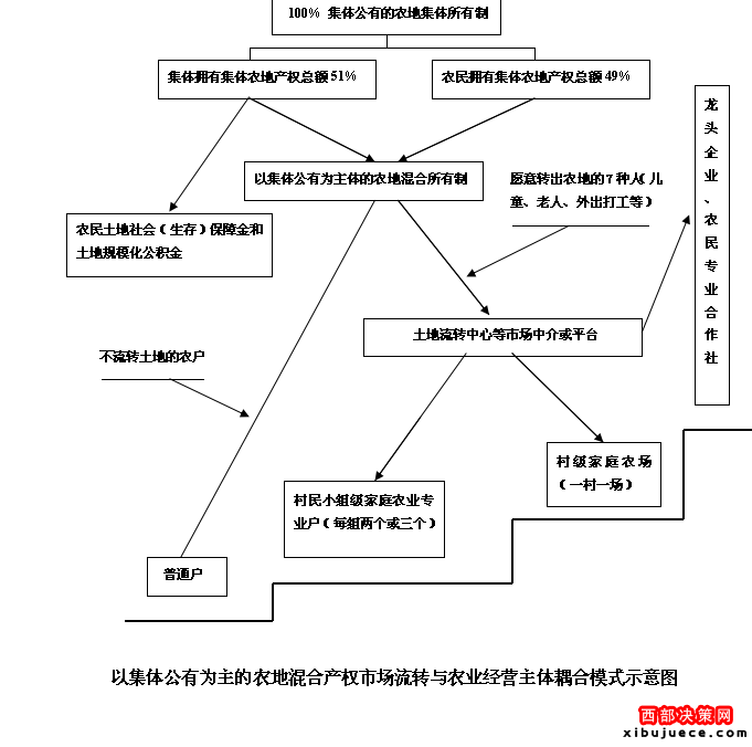 李錄堂向《西部大開發(fā)》介紹,董家?guī)X村示范項目探索建立“以土地集體公有為主,非集體(農(nóng)民)土地所有為輔”的土地集體公有制,通過土地承包經(jīng)營控制權(quán)比例化市場流轉(zhuǎn)試驗,組建土地股份合作社、家庭農(nóng)場和專業(yè)大戶等經(jīng)營主體,實行規(guī)模化集約化經(jīng)營,進而科學地解決人多地少條件下土地產(chǎn)權(quán)市場化可能產(chǎn)生的社會不穩(wěn)定因素以及農(nóng)民農(nóng)地產(chǎn)權(quán)自由進入和退出問題,讓農(nóng)民“退出土地”有保障,“進入土地”有支持,徹底消除農(nóng)民流轉(zhuǎn)土地的后顧之憂,形成“以公有制為主體具有雙重保障的農(nóng)地市場流轉(zhuǎn)機制”。這一農(nóng)村土地改革的新思路是遵照“以公有制為主體,多種所有制經(jīng)濟成分并存”的《憲法》原則,借鑒國有企業(yè)劃分國有股、企業(yè)股和企業(yè)全員持股的經(jīng)驗及城鎮(zhèn)住房公積金改革的做法,將農(nóng)地產(chǎn)權(quán)(農(nóng)地承包經(jīng)營使用權(quán)等)在集體和農(nóng)民之間按集體占51%,農(nóng)民占49%的比例混合分配后再市場化流轉(zhuǎn)。其中集體所占農(nóng)地產(chǎn)權(quán)及收益總額的51%主要用于農(nóng)民土地社會保障金和農(nóng)地規(guī)?;e金,以解決農(nóng)地市場流轉(zhuǎn)過程中失地失業(yè)農(nóng)民的生存和就業(yè)保障問題,其余49%的收益歸農(nóng)民個人所有,進而形成既能保證農(nóng)地集體所有制主導地位,又具有雙重保障和穩(wěn)定性的農(nóng)地產(chǎn)權(quán)市場流轉(zhuǎn)機制。