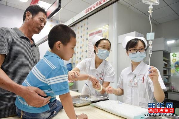 醫(yī)改地方在行動。2016年8月,首期福建省內(nèi)10家公立醫(yī)療機(jī)構(gòu)正式簽訂協(xié)議,成立福建首個(gè)婦幼醫(yī)聯(lián)體。圖為在福建省婦幼保健院,醫(yī)護(hù)人員為患兒打點(diǎn)滴。