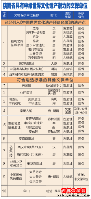 《中國世界文化遺產(chǎn)預(yù)備名單》約5年更新一次,最近一次更新是2012年11月。目前陜西有4處遺址被列入,分別為絲綢之路拓展項(xiàng)目、統(tǒng)萬城遺址、中國明清城墻(西安城墻)、山陜古民居(黨家村古建筑群)。