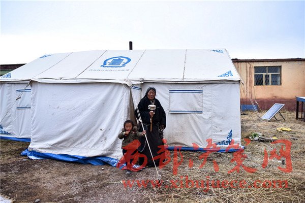 10月18日,雜多縣阿多鄉(xiāng)多加村受災(zāi)牧民尕文與自己的孫女在救災(zāi)帳篷前。