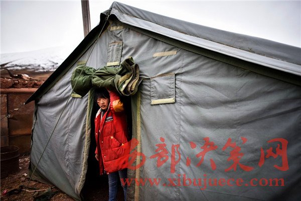 10月18日,雜多縣阿多鄉(xiāng)多加村受災(zāi)牧民尕瑪代文站在安置帳篷門口。