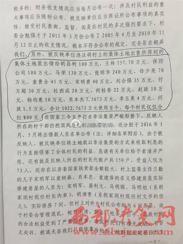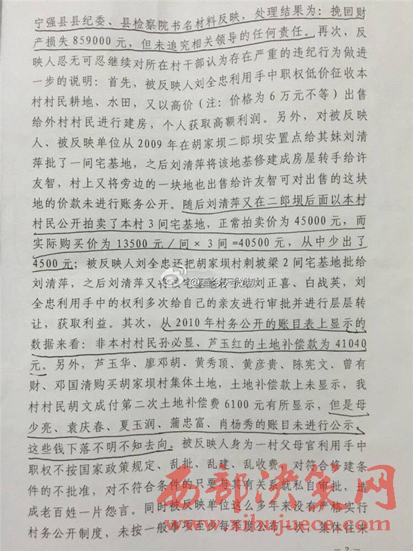 西部決策網(wǎng)訊 近日,有網(wǎng)友微博爆料,陜西省漢中市寧強(qiáng)縣胡家壩鎮(zhèn)胡家壩村,村干部劉全忠利用惠民政策,套取國家大量資金。對于國家扶貧項(xiàng)目,巧立名目、貪污、侵占村民利益。濫用職權(quán)違規(guī)審批宅基地,倒賣村集體土地,并將村上千萬余元出借他人賺取利息,且村務(wù)不公開、賬務(wù)弄虛作假、嚴(yán)重違紀(jì)行為。