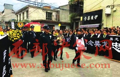 25日晚上,樊龍的遺體告別儀式在武都區(qū)公安局巡警大隊(duì)大院舉行。省公安廳派人專程為樊龍送行,隴南市、武都區(qū)公安民警代表及隴南市、區(qū)有關(guān)單位領(lǐng)導(dǎo)、職工、各界群眾代表、樊龍生前親朋好友,當(dāng)?shù)厥忻窦娂娮园l(fā)趕來參加遺體告別儀式,挽聯(lián)和花圈擺滿了巡警大隊(duì)的院子。