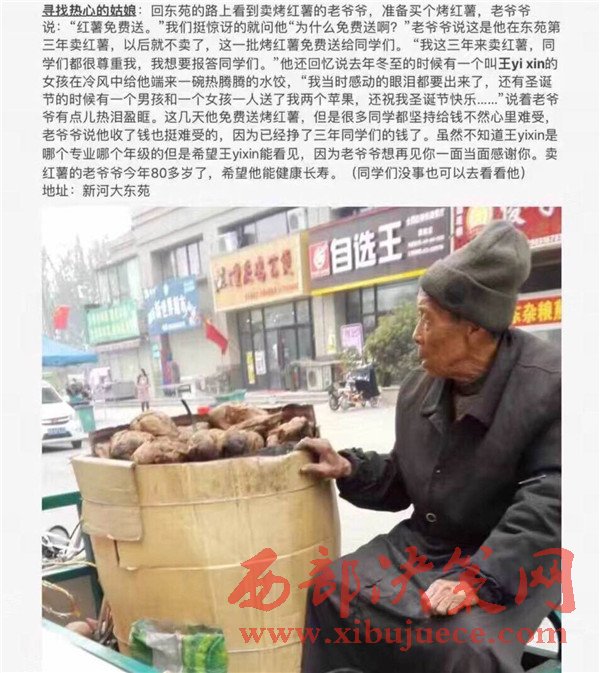 說(shuō)起這位賣紅薯的老爺爺,河南大學(xué)的學(xué)生們印象都十分深刻,紛紛道出了自己和賣紅薯老爺爺之間的暖心事。