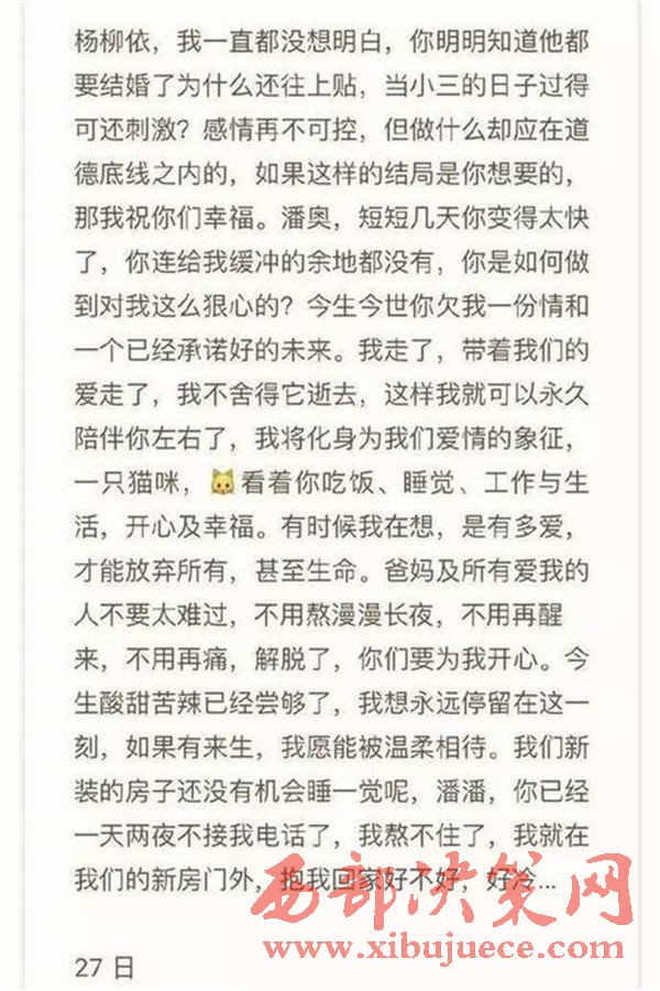 次日凌晨1點(diǎn)20分,段丹峰在朋友圈發(fā)布長文,表達(dá)因感情問題意欲輕生,并配有一張與潘奧相擁的親密合影。在朋友圈中,段丹峰寫道,潘奧有新歡楊某,短短幾 天變化太快,沒有給她留下緩沖的余地,潘奧已經(jīng)一天兩夜沒接她電話,自己此刻正在新房外。據(jù)段丹峰朋友介紹,與潘奧的合影正是今年9月初,兩人去給朋友當(dāng) 伴郎伴娘,在別人婚禮上,潘奧曾向她求婚。