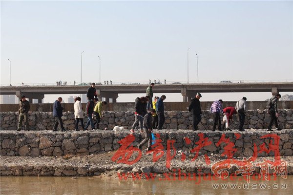 12月27日上午,咸陽湖放水剛結(jié)束,渭城橋下瞬間就變成了漁場,數(shù)百人在橡膠壩附近撿魚捕魚,有人甚至不顧危險跑到淤泥里去撈魚。咸陽湖管理處工作人員提醒,湖底淤泥情況不明,市民切勿涉險下湖撈魚,以免發(fā)生不測。