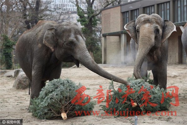當(dāng)?shù)貢r間2017年1月3日,德國柏林,Zoologischer Garten動物園的大象們食用“圣誕樹”美食大餐。