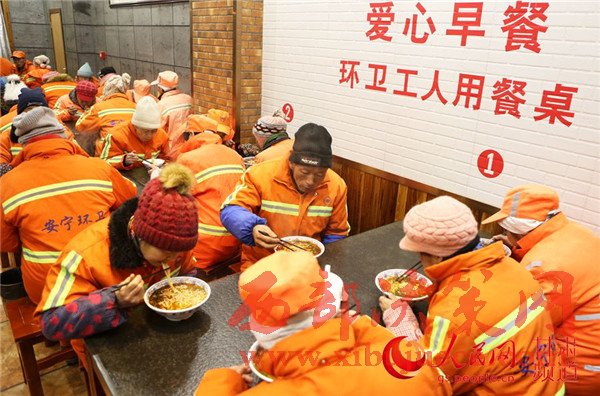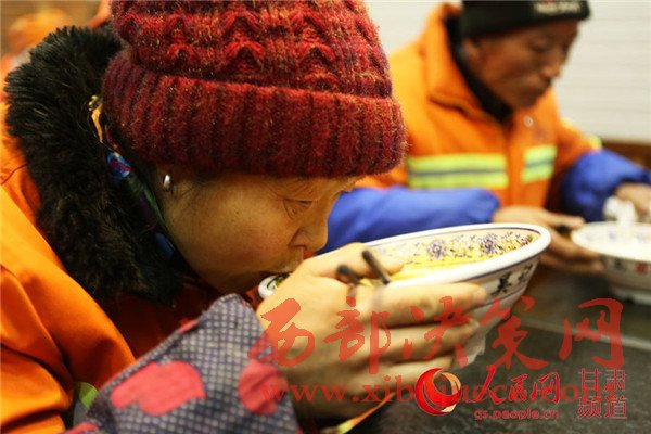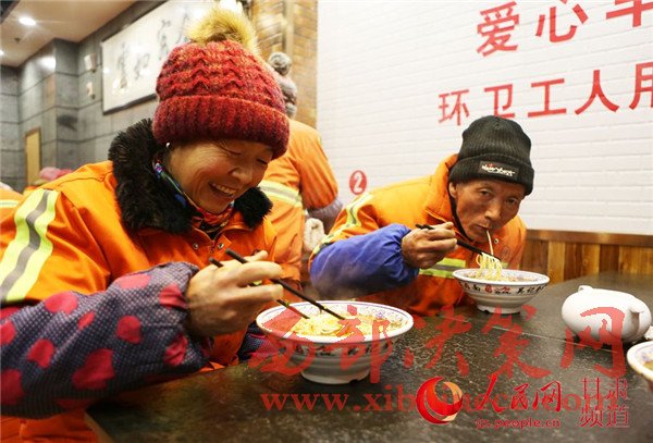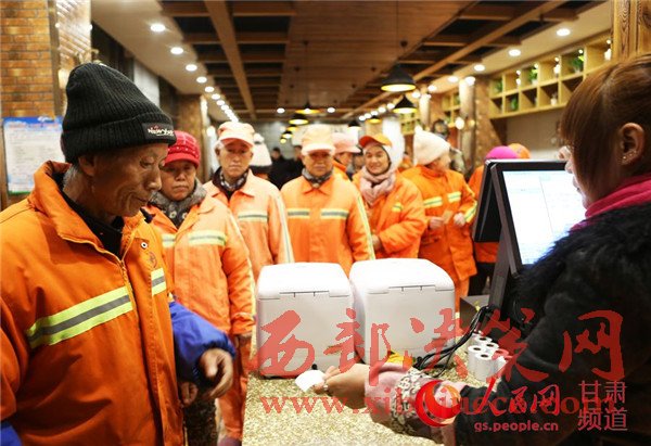 19日,蘭州環(huán)衛(wèi)工在一家牛肉面店享用愛(ài)心早餐。