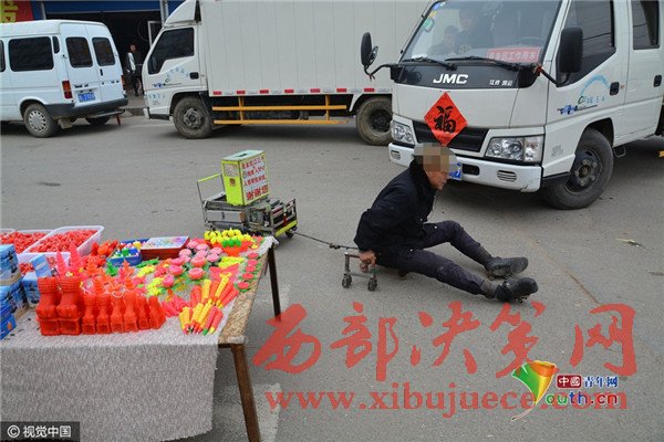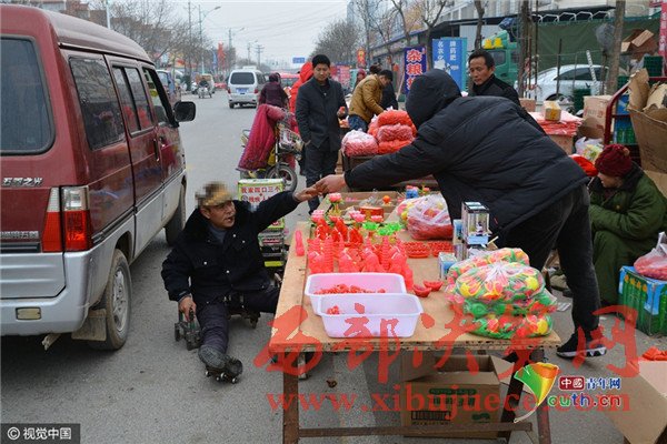 2017年2月6日,在山東省日照市莒縣南關大集上,今年58歲的葛平九,坐在他自己制作的小車上,用兩只手臂作支撐,拖著一雙殘腿,穿梭在車流和人流之間,向路邊賣蠟燭的攤位要求施舍。有愛心的攤主會給他一塊錢,有的會給他一根蠟燭。
