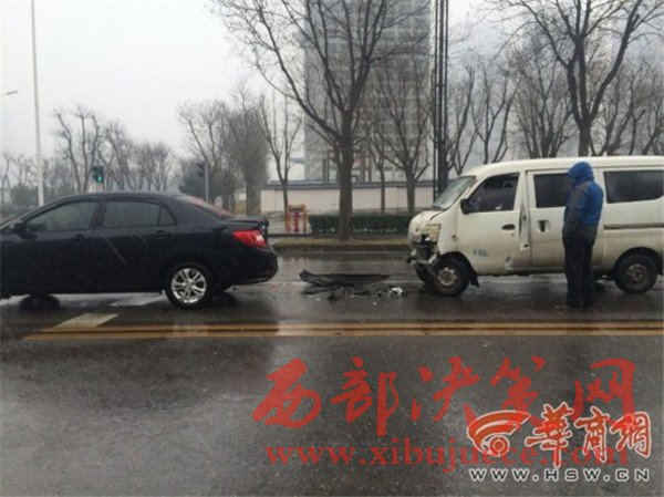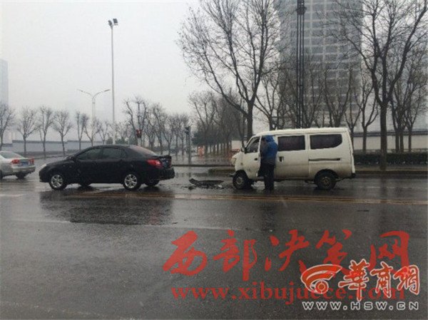 西安降雪,緩解了霧霾天氣,不過雪天路滑,給司機(jī)行車帶來不少麻煩。昨日下午2時(shí)50分許,在西安市雁翔路一處丁字路口,一輛白色面包車因紅燈剎車不及,撞上了前面停車等紅燈的一輛黑色私家車,造成車頭損毀,所幸兩車司機(jī)均未受傷。提醒司機(jī)朋友,雨雪天氣路面濕滑,請謹(jǐn)慎行駛,注意保持安全車距,以免發(fā)生意外。