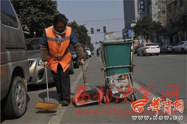 昨日中午12時許,周至縣南大街,66歲的姜益梅推著小車從路東邊在斑馬線處繞到路西邊,她邊走邊掃,不時還要繞過護(hù)欄去沿街商戶門前的人行道上轉(zhuǎn)一下。她已經(jīng)從凌晨5時工作到了現(xiàn)在,再過半小時同事會過來與她倒班。