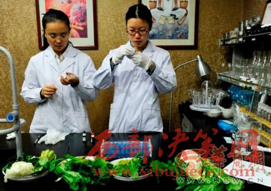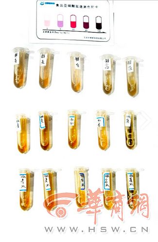 華商報(bào)記者在市場(chǎng)上購(gòu)買(mǎi)了新鮮的菠菜,白菜,小白菜,油麥菜,青菜,拿到西安營(yíng)養(yǎng)學(xué)會(huì),專(zhuān)家通過(guò)實(shí)驗(yàn)的方法,檢測(cè)新鮮蔬菜、冰箱存放48小時(shí)的蔬菜、常溫存放48小時(shí)的蔬菜中亞硝酸鹽含量的變化。