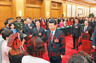 3月8日,中共中央總書(shū)記、國(guó)家主席、中央軍委主席習(xí)近平參加十二屆全國(guó)人大五次會(huì)議四川代表團(tuán)的審議。在“三八”國(guó)際勞動(dòng)?jì)D女節(jié)到來(lái)之際,習(xí)近平代表黨中央、國(guó)務(wù)院,向參加全國(guó)兩會(huì)的女代表、女委員、女工作人員,向全國(guó)各族各界婦女同胞,致以節(jié)日的祝賀和誠(chéng)摯的祝福。這是習(xí)近平同女代表親切交談。