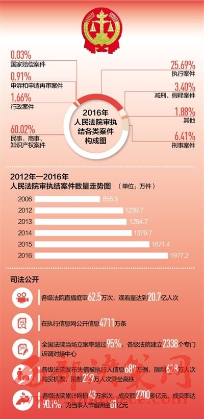 2016年,各級法院向執(zhí)行難全面宣戰(zhàn),共受理執(zhí)行案件614.9萬件,執(zhí)結(jié)507.9萬件,同比分別上升31.6%和33.1%,執(zhí)行到位金額1.5萬億元,同比上升54%。與公安部等10多個部門建立網(wǎng)絡(luò)執(zhí)行查控系統(tǒng),執(zhí)行法官足不出戶即可依法查詢被執(zhí)行人財產(chǎn)和相關(guān)信息,實現(xiàn)了執(zhí)行模式的根本變革。發(fā)布失信被執(zhí)行人信息689萬例,限制628萬人次購買機票,限制229萬人次乘坐高鐵。依法懲治拒不執(zhí)行裁判行為,司法拘留1.6萬人,追究刑事責(zé)任2167人,讓司法裁判真正成為懲治違法失信的利劍。