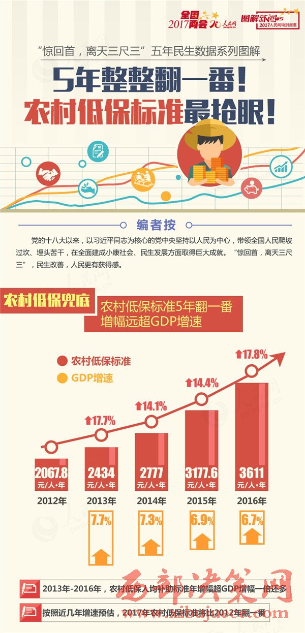 保障低收入群眾基本生活是黨和政府要著力解決好的基礎性工作,是民生保障網(wǎng)需要首先筑牢的“網(wǎng)底”。民政部公布的數(shù)據(jù)更加清晰地說明了問題:2067.8元,2434元,2777元,3177.6元,3611元……2012年至2016年農村低保人均補助標準,每年的增幅遠遠超過GDP增速。按照近幾年增速預估,2017年農村低保人均標準將比2012年翻一番。