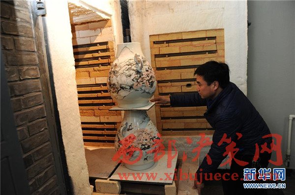 3月24日,在北京京彩瓷博物館里,技師李建強(qiáng)將工藝美術(shù)師們畫好的作品《百鹿尊》推進(jìn)電窯里,準(zhǔn)備燒制。
