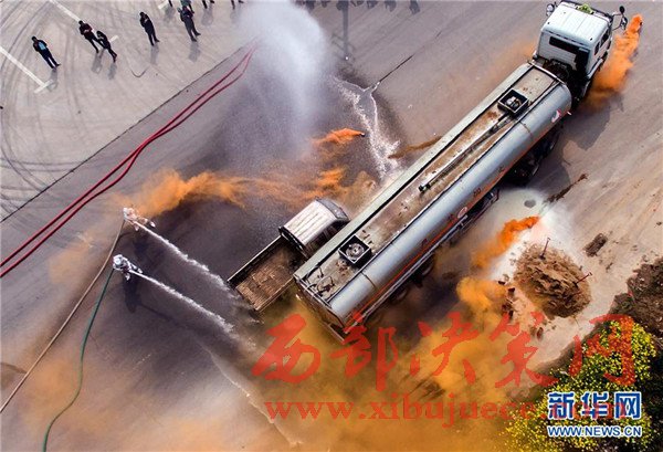 4月6日,參加演練人員對(duì)危化品運(yùn)輸車(chē)輛“交通事故”現(xiàn)場(chǎng)進(jìn)行處置。