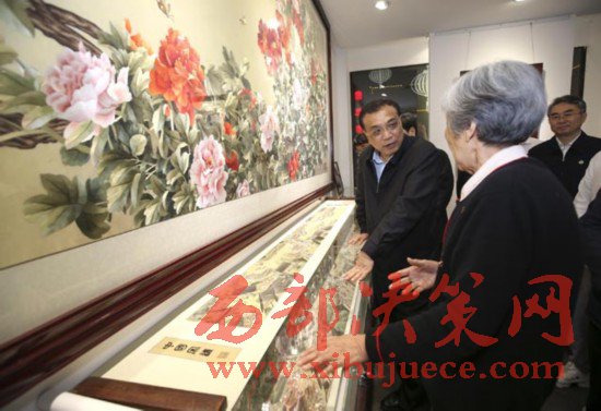 李克強(qiáng)2017年5月8日晚來到開封七盛角民俗文化街,在王素花汴繡館長時(shí)間駐足。82歲的王素花多年繼承創(chuàng)新宋代傳統(tǒng)刺繡工藝,是汴繡領(lǐng)軍人物。總理仔細(xì)觀賞后稱贊她用色“多而不雜”,技藝“爐火純青”。