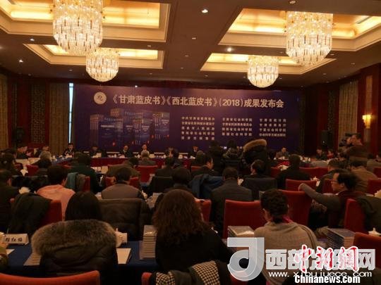 1月8日,2018年度《甘肅藍(lán)皮書》、《西北藍(lán)皮書》成果發(fā)布會(huì)在蘭州舉行。圖為發(fā)布會(huì)現(xiàn)場。馮志軍攝
