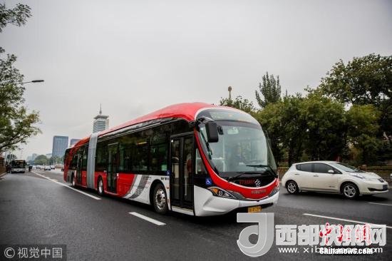 2017年10月22日,北京,首批以“中國紅”為外觀主題的18米純電動(dòng)公交車投入運(yùn)營。圖片來源:視覺中國