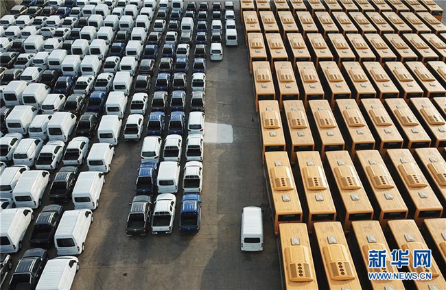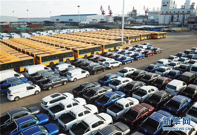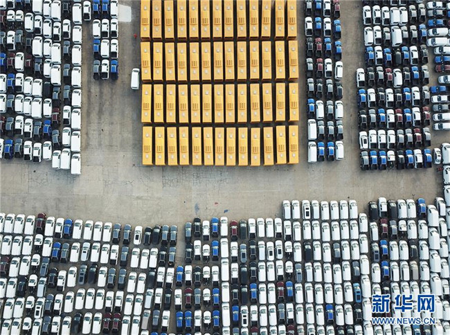 大批國產(chǎn)車輛在江蘇連云港港口碼頭等待裝船(2018年12月31日無人機(jī)拍攝)。新華社發(fā)(耿玉和 攝)