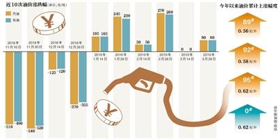 此前的2月28日,國內(nèi)汽油、柴油價格(標(biāo)準(zhǔn)品,下同)分別上調(diào)270元/噸、260元/噸,不僅是我國成品油2019年來的“四連漲”,更是創(chuàng)下今年來最大上漲幅度。3月14日,汽油、柴油價格終于停下上漲的步伐——國內(nèi)成品油價格不作調(diào)整。數(shù)據(jù)顯示,上一次油價擱淺為去年3月14日,成為當(dāng)年唯一的一次擱淺。