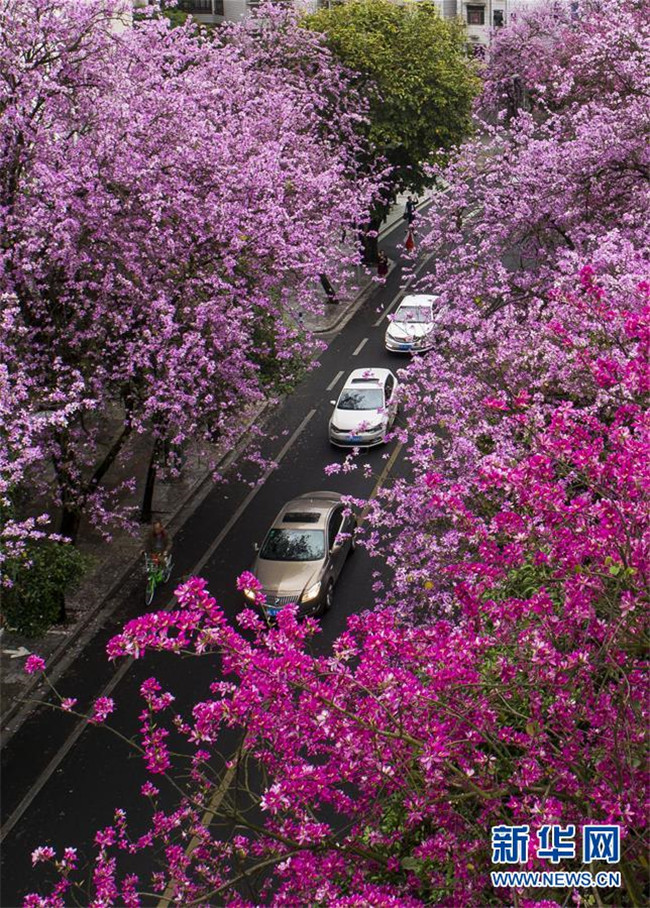 當日,一場大雨過后,廣西柳州市內(nèi)的洋紫荊開得格外嬌艷。時下,柳州市區(qū)27萬株洋紫荊進入盛花期。 新華社記者 黃孝邦 攝
