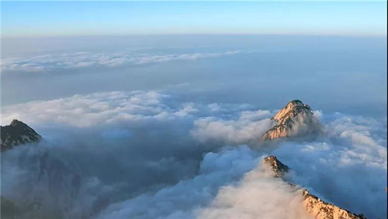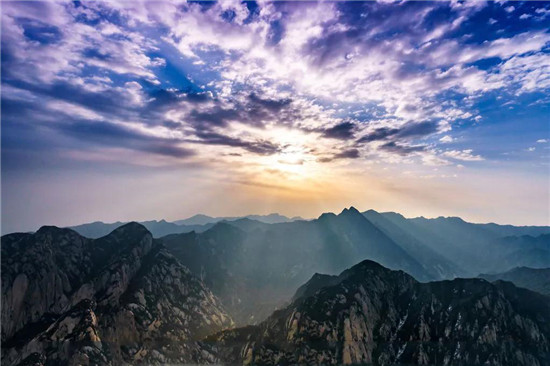 華山最高的山峰,有海拔2154.9米,站在南峰頂,一覽眾山小,遠處就是連綿不斷的秦嶺山脈。