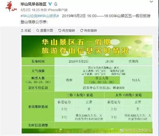 在五一小長假期間游客朋友們還可以通過關(guān)注@華山風景名勝區(qū)新浪微博或者通過景區(qū)LED電子大屏準確知曉各個時間段的登山人數(shù),以便合理調(diào)整自己的游覽計劃。