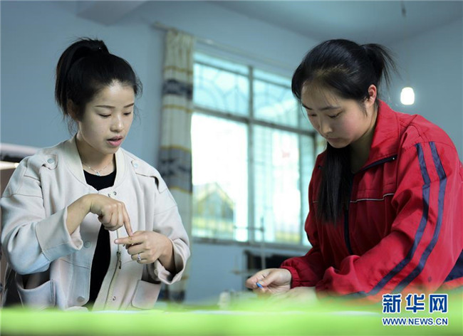 5月15日,在畢節(jié)市特殊教育學校,老師在用手語指導學生縫制床單。 新華社發(fā)(尚宇杰 攝)
