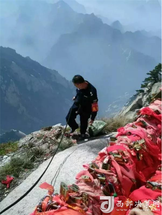 當游客不聽勸阻屢次翻越圍欄拍照留念時,耐心勸阻,警示教育是我們?nèi)A山人的家風;