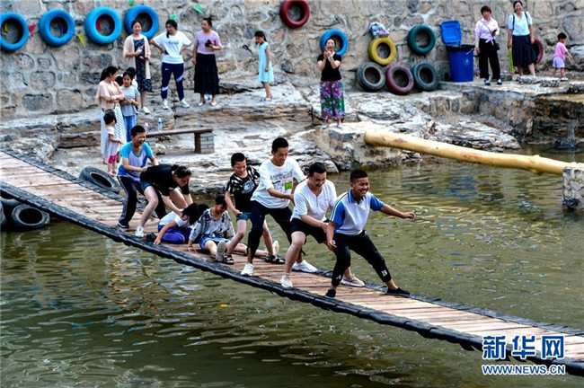 6月22日,游客在河北省涉縣井店鎮(zhèn)劉家村的吊橋上游玩。 新華社記者 王曉 攝