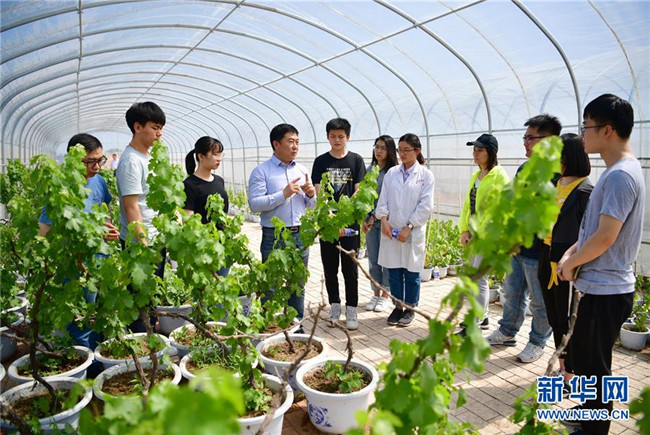 西北農(nóng)林科技大學葡萄酒學院院長房玉林(左四)在為該院學生講解葡萄種植(5月24日攝)。新華社記者邵瑞攝