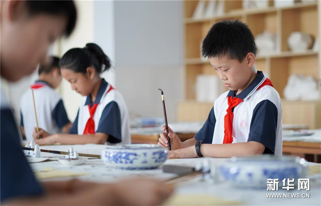 6月26日,內(nèi)丘縣實驗小學(xué)老師在指導(dǎo)學(xué)生練習(xí)國畫創(chuàng)作。新華社記者 朱旭東 攝