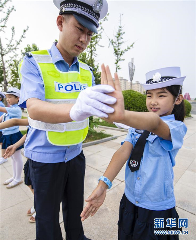 7月9日,武邑縣公安交警大隊(duì)的民警指導(dǎo)“小交警”學(xué)習(xí)交通指揮手勢(shì)。新華社記者 李曉果 攝