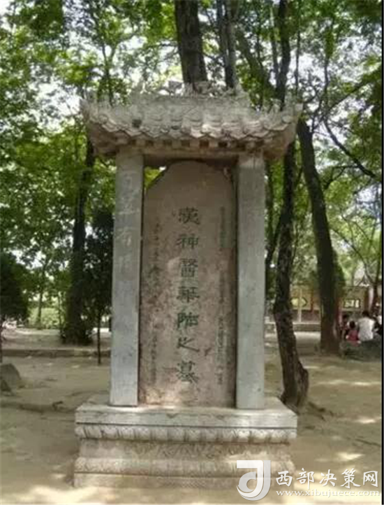 神醫(yī)華佗墓,在石舫東邊的巨石旁,有一《漢神醫(yī)華陀墓》碑。華陀死后并沒葬于此,但為什么有墓碑呢?據(jù)《后漢書•華陀傳》記載:當(dāng)年華陀有一好友名魯先生隱居在華山白麓龕,華陀常來華山探友,且常留住這里,和魯先生一起作五禽游戲,一起采藥、制藥濟(jì)世。他在平時(shí)總愛穿戴魯先生的道袍方巾,腰系一個(gè)大藥葫蘆,下山為百姓診治疾病。被曹操殺害后,冤魂直來華山,向好友訴屈。魯先生驚覺,即下山探詢,獲得確實(shí)噩耗后,魯先生把華陀衣物用具在紅巖村西修了一座衣冠冢,并且嚎啕痛哭送葬?,F(xiàn)墓已無存,也不知何時(shí)何人將墓碑移至玉泉院內(nèi)。