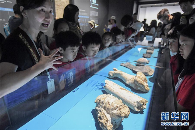 7月24日,小朋友在湖南省博物館聽工作人員講解化石展品。