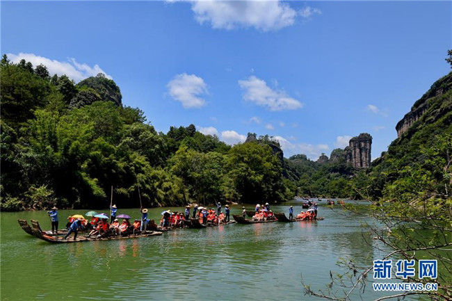 盛夏的福建武夷山,正值暑期旅游高峰,游客乘竹筏沿九曲溪漂流而下,欣賞沿岸美麗風(fēng)光。