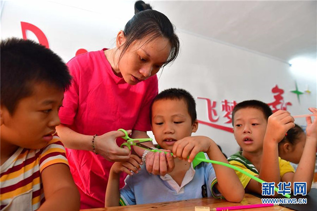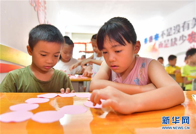 8月17日,在廣西柳州市融安縣“老鄉(xiāng)家園”,孩子們?cè)?ldquo;七彩假期”手工課上學(xué)做手工。新華社記者 黃孝邦 攝