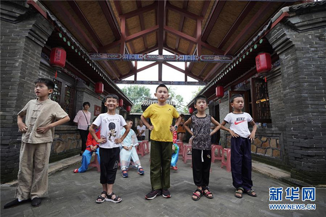 8月20日,孩子們在河北省秦皇島市北戴河“裴艷玲藝術(shù)傳承基地”學(xué)習(xí)表演京劇。