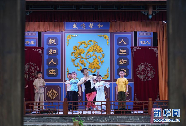 8月20日,河北省秦皇島市北戴河“裴艷玲藝術(shù)傳承基地”的老師在培訓(xùn)孩子們表演京劇。