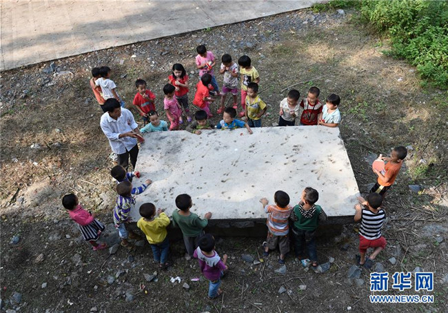在廣西全州縣白寶鄉(xiāng)北山村小學(xué),唐廣芳老師在給學(xué)生上體育課(2016年4月26日攝)。新華社記者 陸波岸 攝