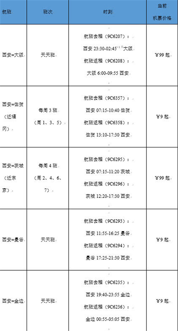 日前從春秋航空了解到,從10月27日起,春秋航空對(duì)其西安始發(fā)航線做出重大調(diào)整,陸續(xù)新開西安飛日本茨城(近東京)、日本佐賀(近福岡)、泰國曼谷、柬埔寨金邊4條國際航線,并將目前每周1班的西安至日本大阪航線加密為每天1班。