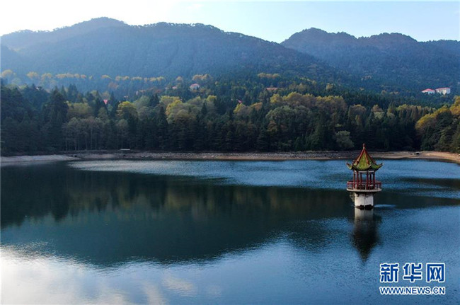 這是10月10日在廬山風(fēng)景區(qū)內(nèi)拍攝的蘆林湖(無人機拍攝)。新華社記者 胡晨歡 攝