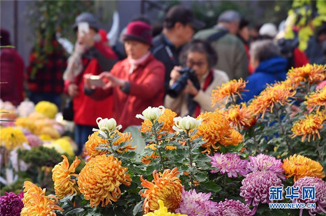 11月4日,人們?cè)诰栈ü?jié)上觀賞菊花。