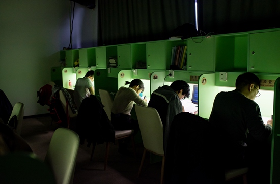 11月22日,北京中關(guān)村一家付費自習室內(nèi),顧客在“暗室”中學習。正值考研季,付費自習室里的多數(shù)顧客都是為考研而來。