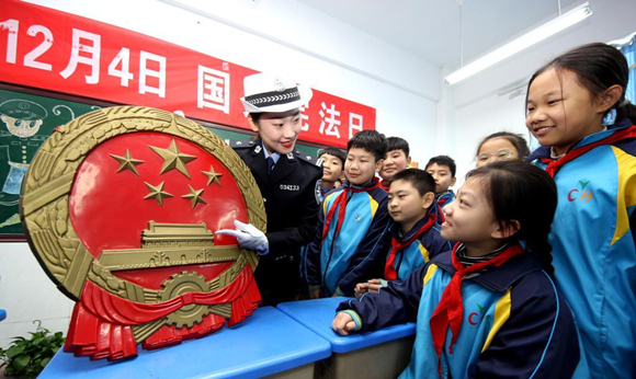2019年12月3日,在第六個(gè)“國(guó)家憲法日”到來(lái)之際,山東省棗莊市公安局嶧城分局交警大隊(duì)一名交警在荀子小學(xué)為學(xué)生們普及憲法知識(shí)。吉喆 攝(人民圖片)