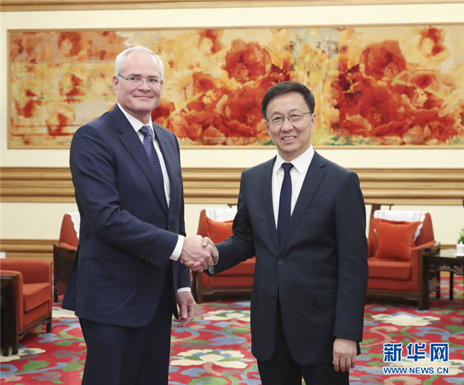 12月3日,中共中央政治局常委、國務(wù)院副總理韓正在北京中南海會見美國??松梨诠径麻L兼首席執(zhí)行官伍德倫。 新華社記者 丁海濤 攝