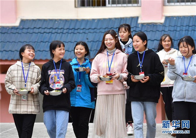 12月5日,在廣西融水苗族自治縣保桓中學(xué),林洋港(左四)和學(xué)生們從食堂打飯出來(lái)。林洋港是西北工業(yè)大學(xué)的在讀碩士研究生,今年9月來(lái)到融水苗族自治縣保桓中學(xué)任物理老師。新華社記者 黃孝邦 攝