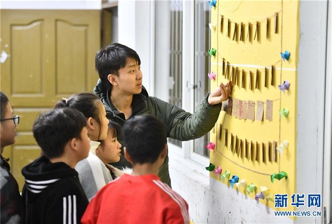 12月5日,在廣西融水苗族自治縣民族中學(xué),郭浩坤在教室里看同學(xué)們的心愿卡。郭浩坤是西北工業(yè)大學(xué)的在讀碩士研究生,今年9月來(lái)到融水苗族自治縣民族中學(xué),擔(dān)任物理老師。 新華社記者 黃孝邦 攝